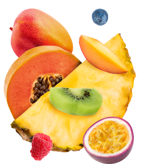 ALBUMEN, WATER, CHICORY FIBER, SUNFLOWER OIL, SWEETENER: MALTITOL-ERYTHRITOL- STEVia, ACIDITY REGULATOR: LACTIC ACID, NATURAL FRUIT TROPICAL FLAVOR, THICKENER: GUAR GUM, DEHYDRATED MANGO POWDER.